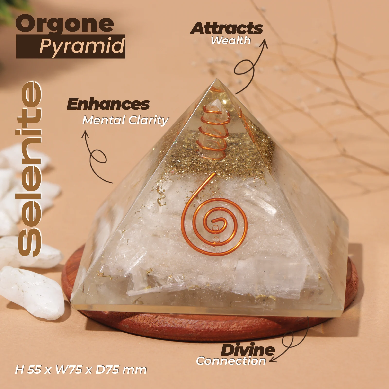 This Selenite Pyramid induces mental clarity and emotional stability with its ethereal vibration.